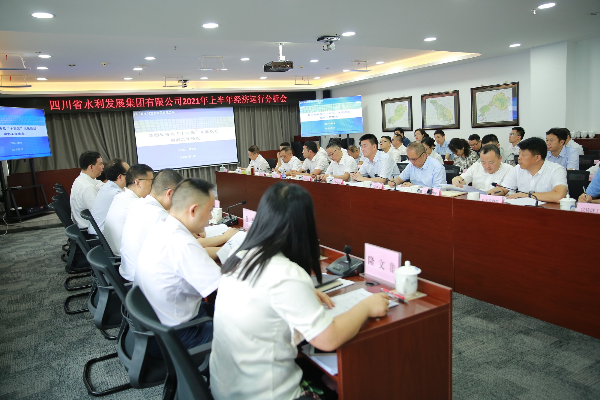 2021年7月14日,四川省水利發展集團有限公司召開2021年上半年經濟運行分析會,總結分析2021年上半年經濟運行情況,通報“十四五”規劃編制工作情況,研究部署下半年經營工作。集團黨委書記、董事長鐘杰主持會議,集團領導班子成員尹曉東、鄔清富、王剛強、代勇、黃永沾、吳軍、羅國書、隆文非出席會議,集團總部各部門負責人和下屬企業主要負責人、及部門負責人參加會議。