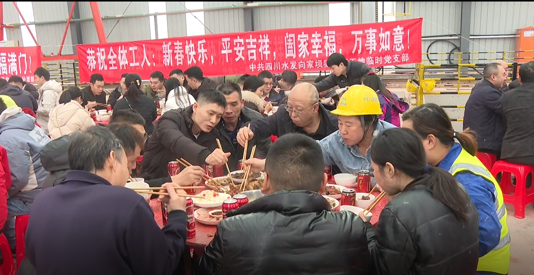 向家壩灌區北總干渠一期一步貓兒沱江底隧洞的施工現場,機器轟鳴,運輸車輛往來穿梭,現場一片忙碌景象。貓兒沱江底隧洞作為一期工程的控制性重難點工程,百余名建設者春節期間堅守工作崗位,只為順利穿越岷江江底,確保按期貫通。1月31日,正值大年三十,為了讓建設者們過上一個舒心的新年,項目部特意為來自五湖四海的建設者們準備了一場充滿濃濃年味的壩壩宴,糖醋鯉魚、梅菜扣肉、紅燒雞……一盤盤具有年味兒的菜肴依次上桌,工地上的團年飯就此展開,大家一起吃團年飯,迎接虎年的到來。