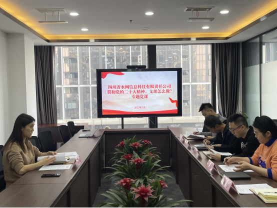 1月31日,投資公司下屬水網科技公司黨支部為深入貫徹落實黨的二十大會議精神,組織專題黨課教育活動,結合經營發展實際,開年即謀劃公司全年重點工作。黨支部書記馬璐以《貫徹黨的二十大精神,支部怎么做?》為主題,圍繞黨的二十大報告和2023年全國水利工作會議的精神為公司全體黨員職工講授了專題黨課。
