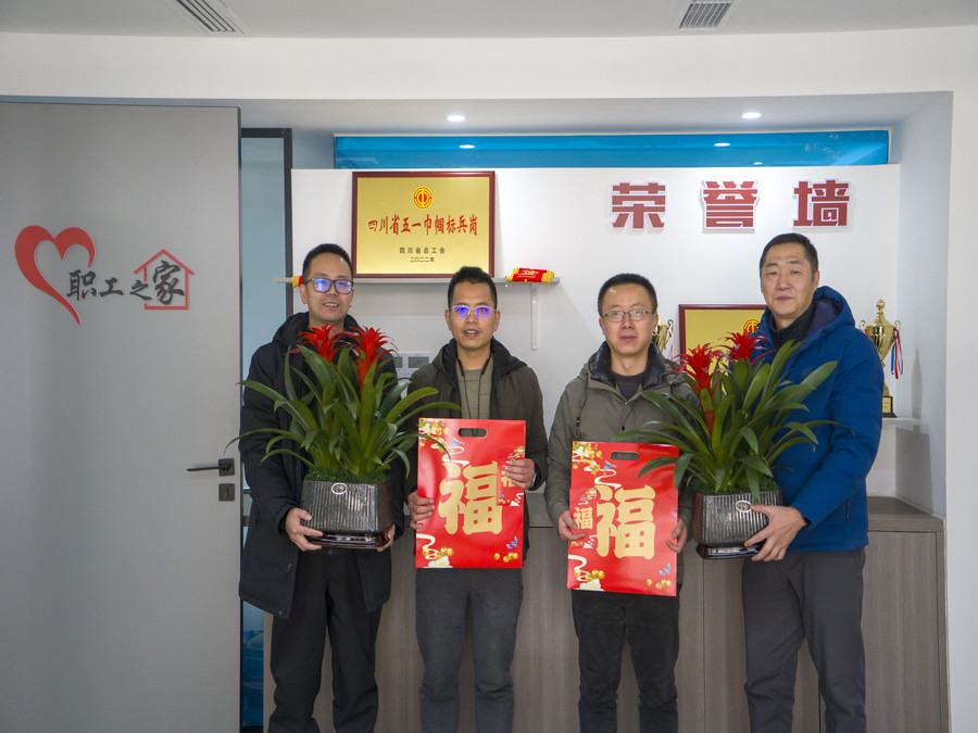 1月18日,成都市青羊區草堂街道總工會副主席葉兵慰問公司“青羊工匠”唐全民、陳昌盛。