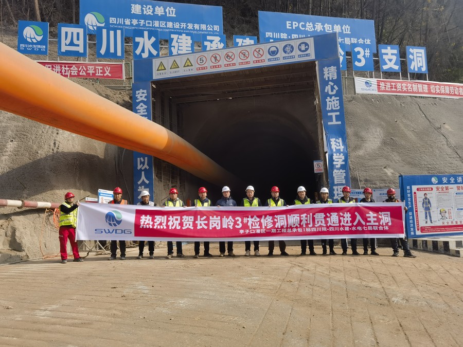 長崗嶺隧洞全長9.748km,是Ⅰ標最長隧洞,也是關鍵線路控制制性工程,其中2#檢修支洞全長260m,其坡度陡降大,施工難度高,3#檢修支洞全長534m。項目參建各方團結合作,克服眾多不利施工因素,迎難而上,黨員干部日夜堅守,攻堅克難,精心組織落實貫通方案,嚴格管理,緊盯每一道施工工序,確保安全順利完成了階段性施工目標任務,為亭子口灌區一期工程I標段能按期完工奠定了堅實基礎。
