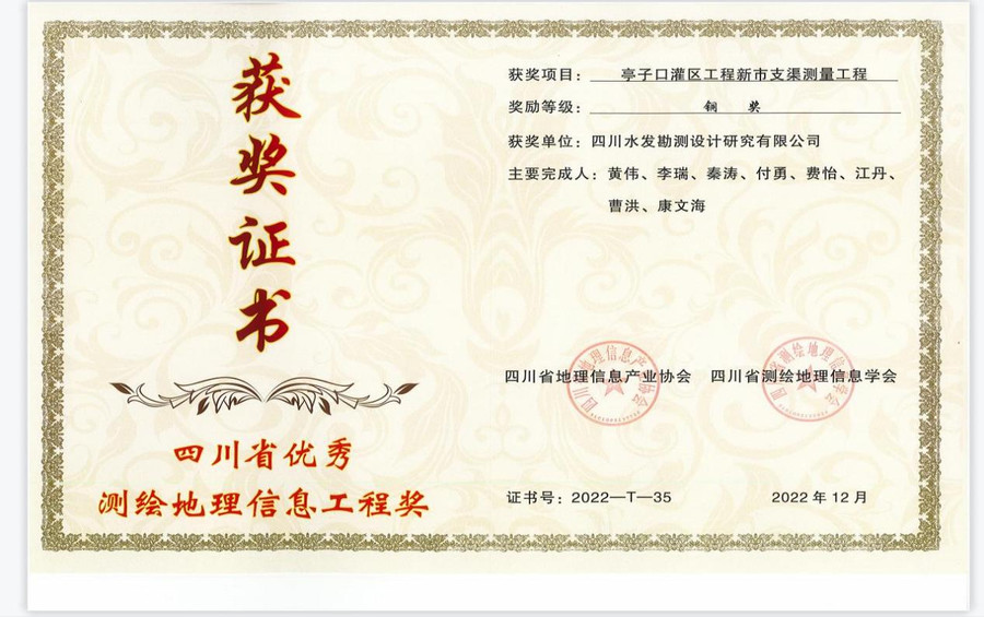 經四川省測繪地理信息學會和四川省地理信息產業協會聯合評選認定,水發集團設計公司測繪分院完成的“引大濟岷工程地質高陡邊坡分析測繪”和“亭子口灌區工程新市支渠測量工程”兩個項目分別榮獲“2022年四川省優秀測繪地理信息工程獎”金獎和銅獎。