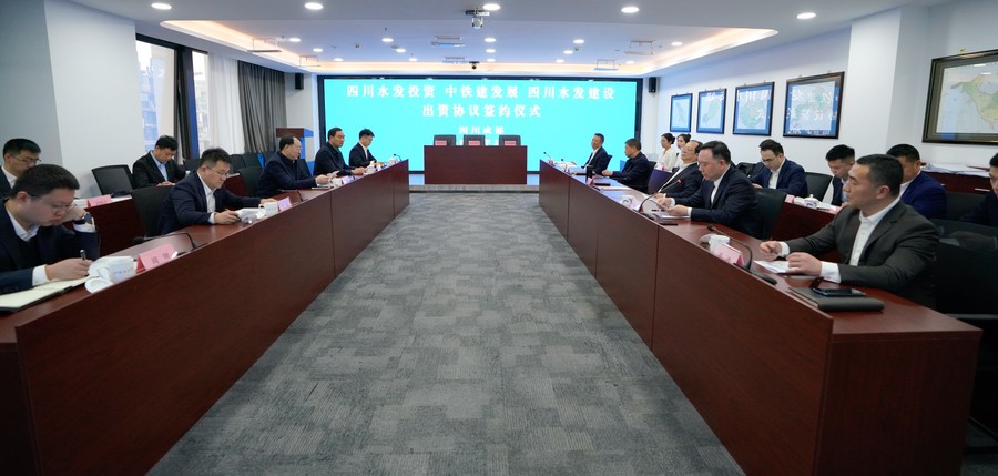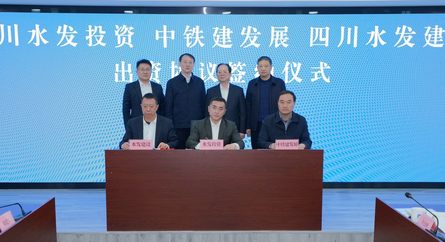四川水發(fā)投資有限公司黨委副書記、總經理郎波,四川水發(fā)建設有限公司副總經理李銀剛,中鐵建發(fā)展集團公司副總經理劉小剛共同簽署出資協(xié)議。