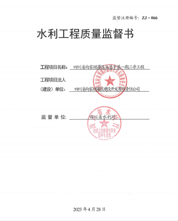 4月28日,《四川省向家壩灌區(qū)一期二步工程質(zhì)量監(jiān)督書》(監(jiān)督注冊編號:ZJ-066)正式下發(fā)至公司,標(biāo)志著向家壩灌區(qū)北總干渠一期二步工程質(zhì)量監(jiān)督手續(xù)順利取得。
