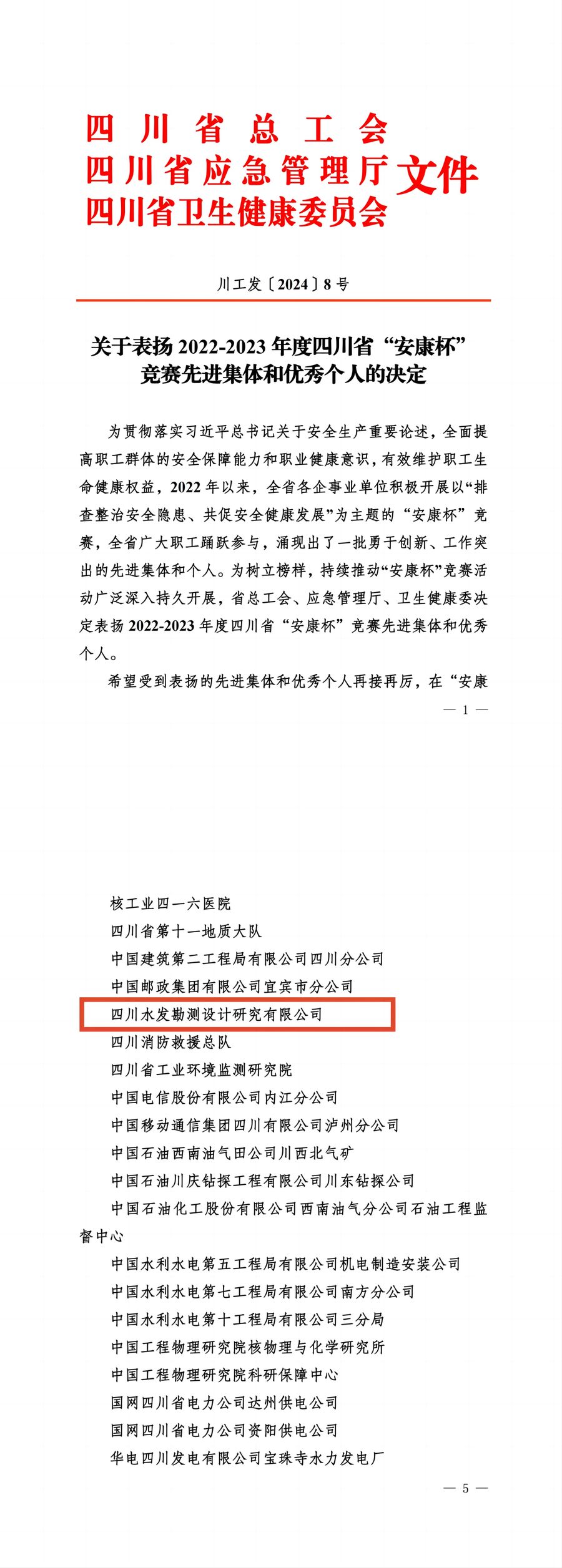 近日,四川省總工會、四川省應(yīng)急管理廳、四川省衛(wèi)生健康委員會聯(lián)合表揚2022—2023年度四川省“安康杯”競賽先進集體和優(yōu)秀個人,設(shè)計公司獲得2022—2023年度四川省“安康杯”競賽先進集體。