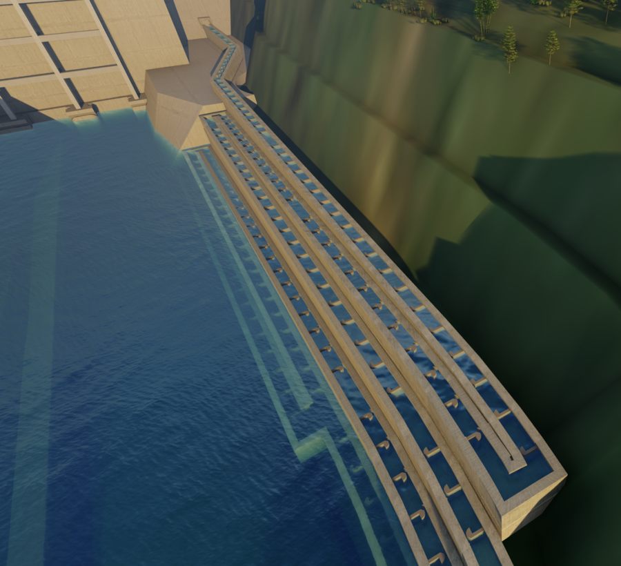 黃石盤水庫魚道工程采用了一種能夠適應庫水位變幅的升魚塔結構,該結構已獲得國家實用新型專利。升魚塔結構采用升船機的原理,自動控制升魚塔內水位的自由升降,實現升魚塔內水位與上游水庫任意水位銜接,達到了魚類通過升魚塔自由進入上游水庫的目的。